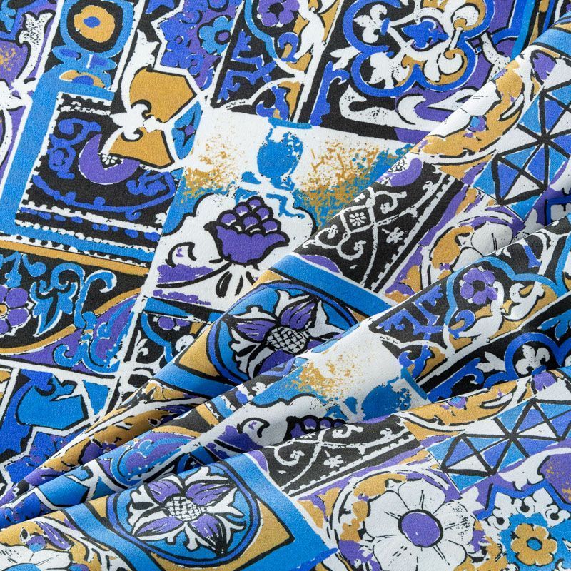 Итальянский матовый шелк в сине-фиолетовых оттенках с оригинальным принтом. Ткань тонкая, не просвечивается, отлично драпируется, легкая и струящаяся. Идеально подойдет для пошива платьев и сарафанов расклешенных моделей, с воланами, рюшами, летящих юбок, топов, блузки, рубашки, костюма в пижамном стиле.