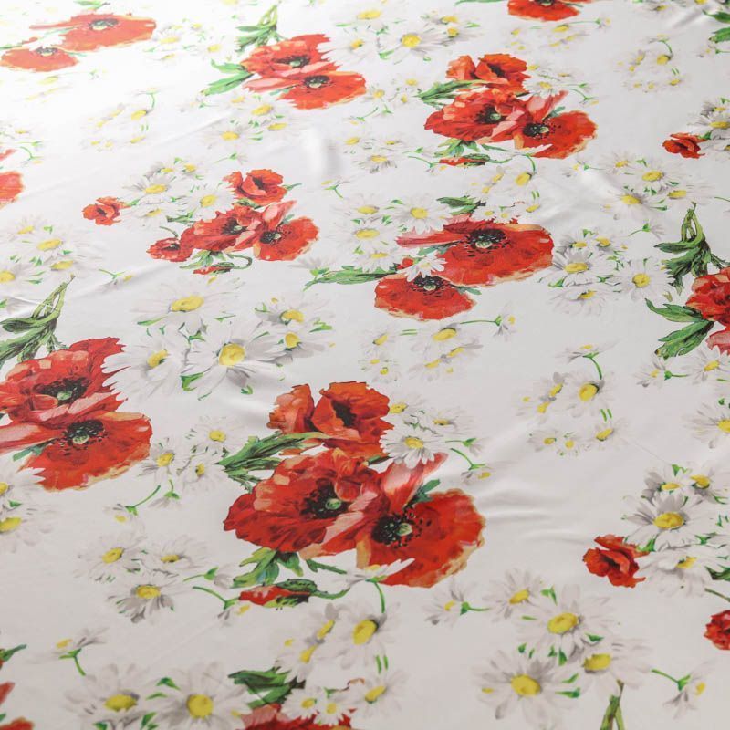 Итальянский матовый шелк с летним ярким принтом на белом фоне, тонкий, слегка прозрачный, отлично драпируется, легкий и струящийся с креповой поверхностью. Идеально подойдет для пошива платьев и сарафанов расклешенных моделей, с воланами, рюшами, летящих юбок, топов, блузки, рубашки, костюма в пижамном стиле.