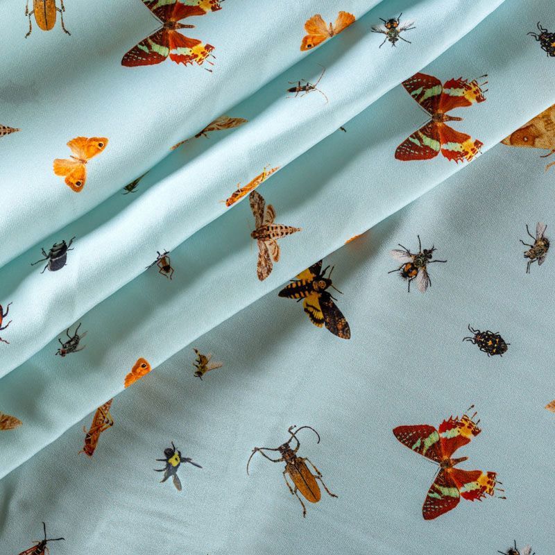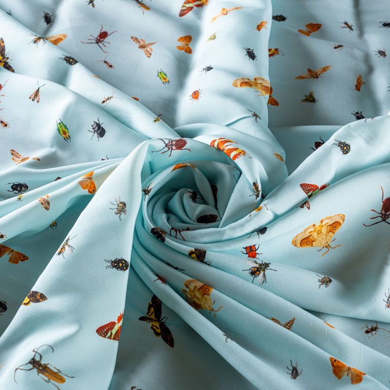 Итальянский шелк с матовой лицевой поверхностью и атласной изнанкой с анималистическим принтом на светло-голубом фоне, тонкий, слегка прозрачный, отлично драпируется, не много тянется за счет эластана в составе, легкий и струящийся. Идеально подойдет для пошива платьев и сарафанов расклешенных моделей, с воланами, летящих юбок, топов, блузки, костюма в пижамном стиле.
