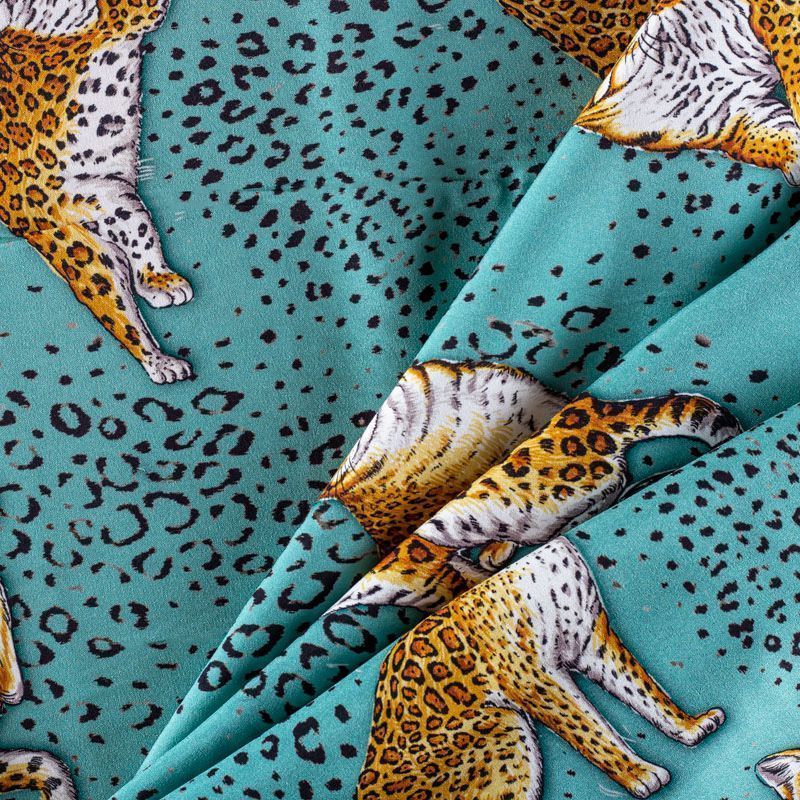 Итальянский матовый шелк бирюзового оттенка с узнаваемым принтом диких кошек от известного бренда. Ткань тонкая, не просвечивается, отлично драпируется, легкая и струящаяся, тянется за счет эластана в составе, лицевая сторона креповая, изнанка - атласная. Идеально подойдет для пошива платьев и сарафанов расклешенных моделей, с воланами, рюшами, летящих юбок, топов, блузки, рубашки, костюма в пижамном стиле.