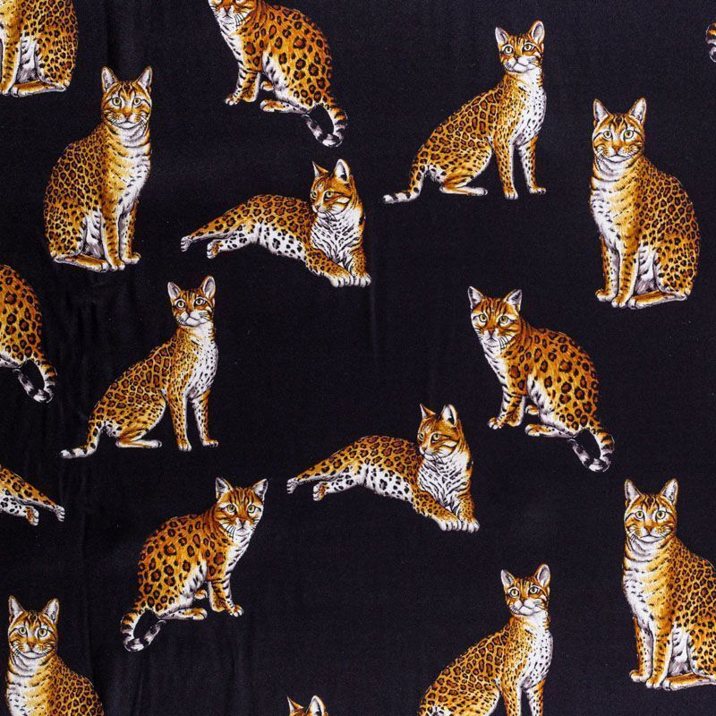 Итальянский матовый шелк черного оттенка с узнаваемым принтом диких кошек от известного бренда. Ткань тонкая, не просвечивается, отлично драпируется, легкая и струящаяся, тянется за счет эластана в составе, лицевая сторона креповая, изнанка - атласная. Идеально подойдет для пошива платьев и сарафанов расклешенных моделей, с воланами, рюшами, летящих юбок, топов, блузки, рубашки, костюма в пижамном стиле.