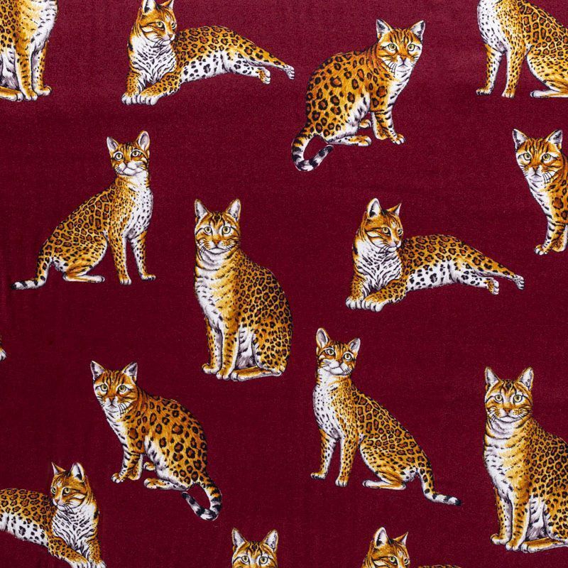 Итальянский матовый шелк бордового оттенка с узнаваемым принтом диких кошек от известного бренда. Ткань тонкая, не просвечивается, отлично драпируется, легкая и струящаяся, тянется за счет эластана в составе, лицевая сторона креповая, изнанка - атласная. Идеально подойдет для пошива платьев и сарафанов расклешенных моделей, с воланами, рюшами, летящих юбок, топов, блузки, рубашки, костюма в пижамном стиле.