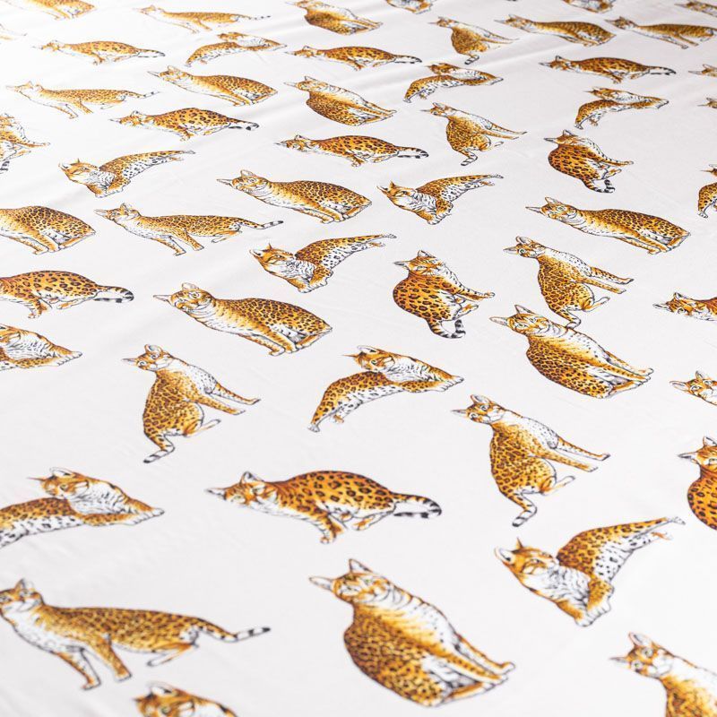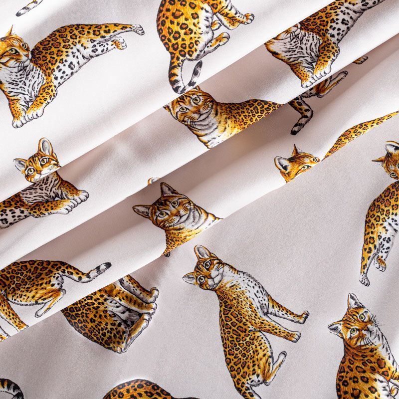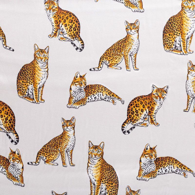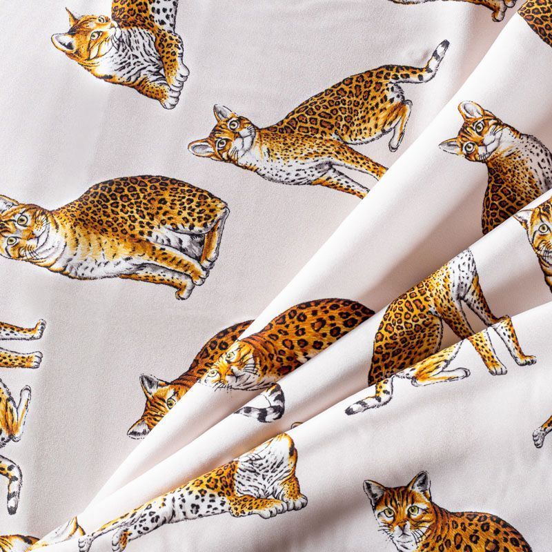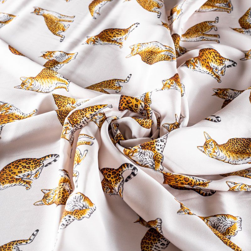 Итальянский матовый шелк молочного оттенка с узнаваемым принтом диких кошек от известного бренда. Ткань тонкая, не просвечивается, отлично драпируется, легкая и струящаяся, тянется за счет эластана в составе, лицевая сторона креповая, изнанка - атласная. Идеально подойдет для пошива платьев и сарафанов расклешенных моделей, с воланами, рюшами, летящих юбок, топов, блузки, рубашки, костюма в пижамном стиле.