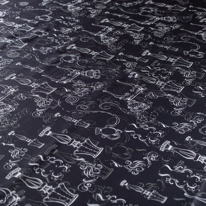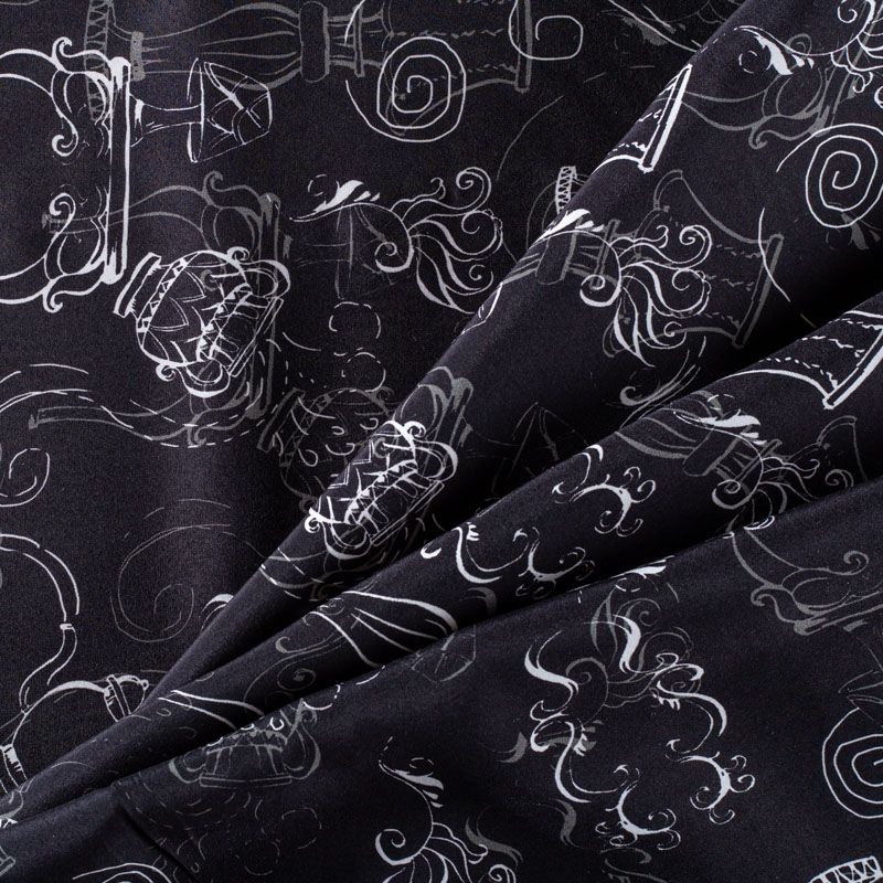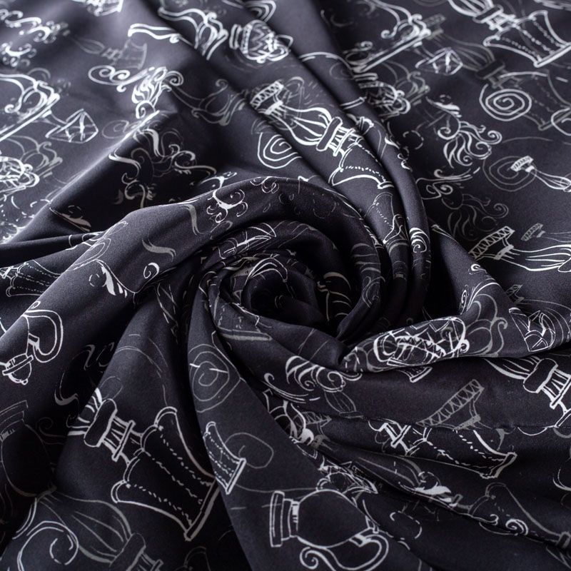 Итальянский матовый шелк черного цвета с узнаваемым принтом. Ткань тонкая, не просвечивается, отлично драпируется, легкая и струящаяся, тянется за счет эластана в составе, лицевая сторона креповая, изнанка - атласная. Идеально подойдет для пошива платьев и сарафанов расклешенных моделей, с воланами, рюшами, летящих юбок, топов, блузки, рубашки, костюма в пижамном стиле.