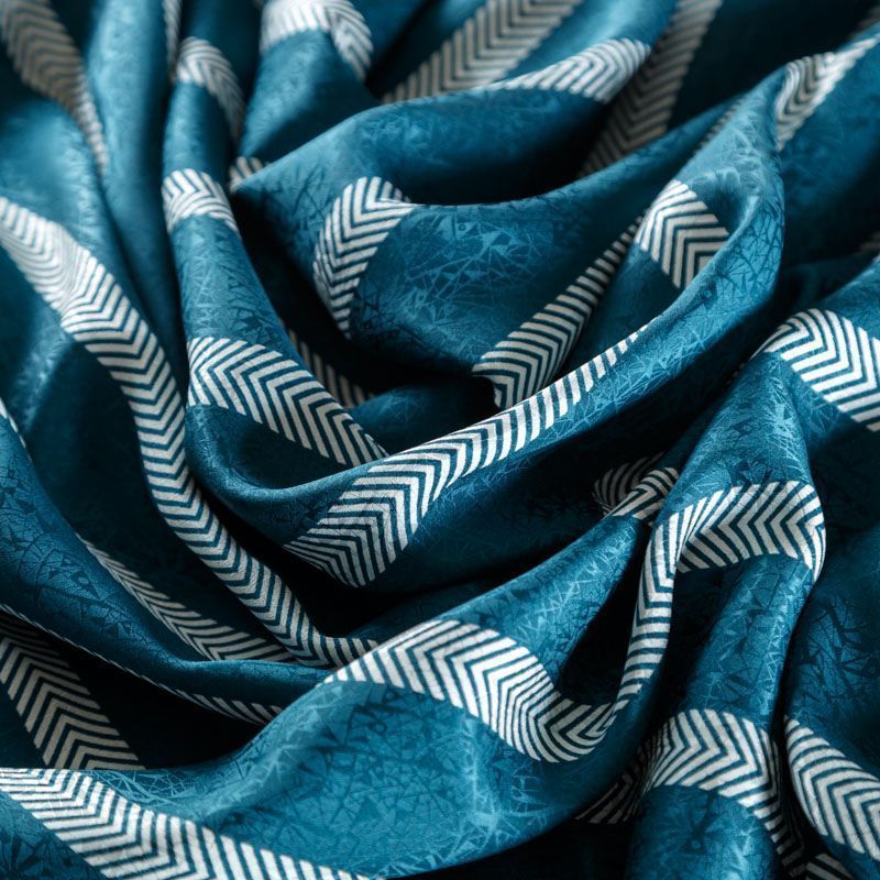 Итальянский купонный матовый жаккардовый шелк с геометрическим принтом. Ткань средней плотности, не просвечивает, струится, хорошо драпируется. Поверхность глядкая, имеет благородный сатиновый блеск. Подойдет смелых образов: летних платьев и сарафанов, как летящих фасонов, так и скроенных по косой, накидок, юбок, блузок, костюмов, широких брюк, домашней одежды.