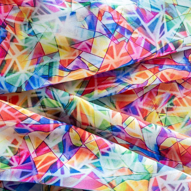 Плательно-блузочный штапель с добавлением шелка с ярким геометрическим принтом. Ткань очень мягкая, нежная, пластичная, шелковистая на ощупь, хорошо драпируется, практичная. Особенно актуальна летом, шелк-штапель очень легкий, обволакивающий прохладой. Идеален для пошива летней детской одежды, сарафанов, платьев, юбок, блузок, домашней одежды: халатов, ночной пижамы.