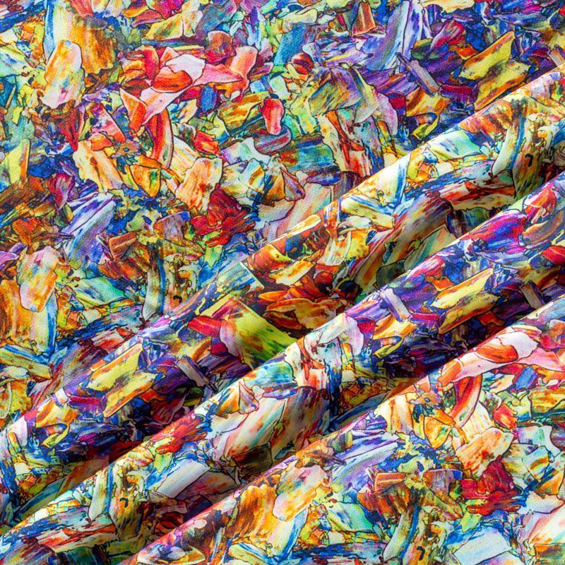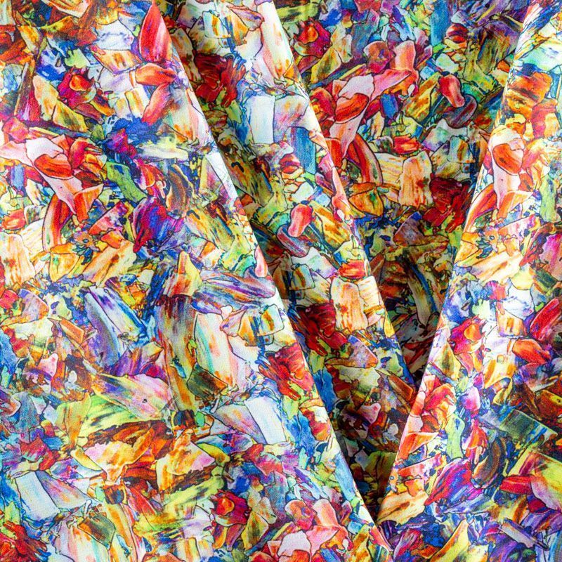 Плательно-блузочный штапель с добавлением шелка с разноцветным абстрактным принтом. Ткань очень мягкая, нежная, пластичная, шелковистая на ощупь, хорошо драпируется, практичная. Особенно актуальна летом, шелк-штапель очень легкий, обволакивающий прохладой. Идеален для пошива летней детской одежды, сарафанов, платьев, юбок, блузок, домашней одежды: халатов, ночной пижамы.