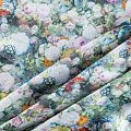 Плательно-блузочный штапель с добавлением шелка с акварельным цветочным принтом. Ткань очень мягкая, нежная, пластичная, шелковистая на ощупь, хорошо драпируется, практичная. Особенно актуальна летом, шелк-штапель очень легкий, обволакивающий прохладой. Идеален для пошива летней детской одежды, сарафанов, платьев, юбок, блузок, домашней одежды: халатов, ночной пижамы.