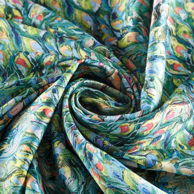 Плательно-блузочный штапель с добавлением шелка зеленого оттенка с цветным абстрактным акварельным принтом. Мягкий, нежный, пластичный, шелковистый на ощупь, хорошо драпируется, практичный. Особенно актуален летом, он очень легкий, обволакивающий прохладой. Идеален для пошива летней детской одежды, сарафанов, платьев, юбок, блузок, домашней одежды: халатов, ночной пижамы.