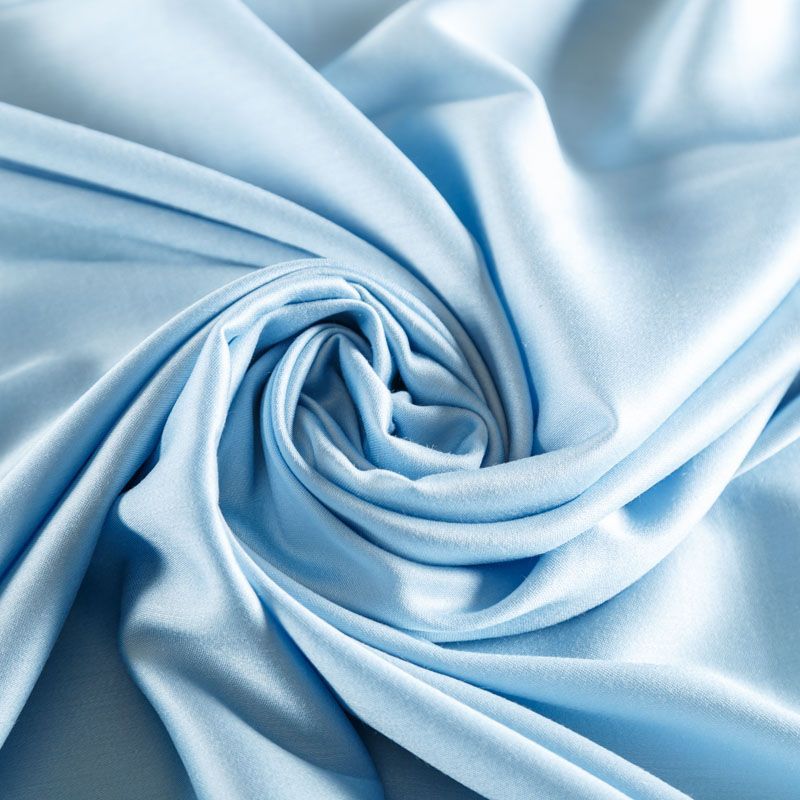 Плательно-блузочный штапель с добавлением шелка в голубом оттенке. Мягкий, нежный, пластичный, шелковистый на ощупь, хорошо драпируется, практичный, тянется за счет эластана в составе. Особенно актуален летом, он очень легкий, обволакивающий прохладой. Идеален для пошива летней детской одежды, сарафанов, платьев, юбок, блузок, домашней одежды: халатов, ночной пижамы.