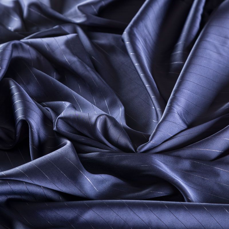 Тонкая, легкая, струящаяся ткань, декорированная тонкими вертикальными полосками люресовой нити, не просвечивает, очень нежная и прятная к телу, обладает благородным атласным блеском, хорошо драпируется, тянется за счет эластана в составе. Идеально подойдет для пошива блузок, платьев и юбок, а также топов, платков, домашней одежды.