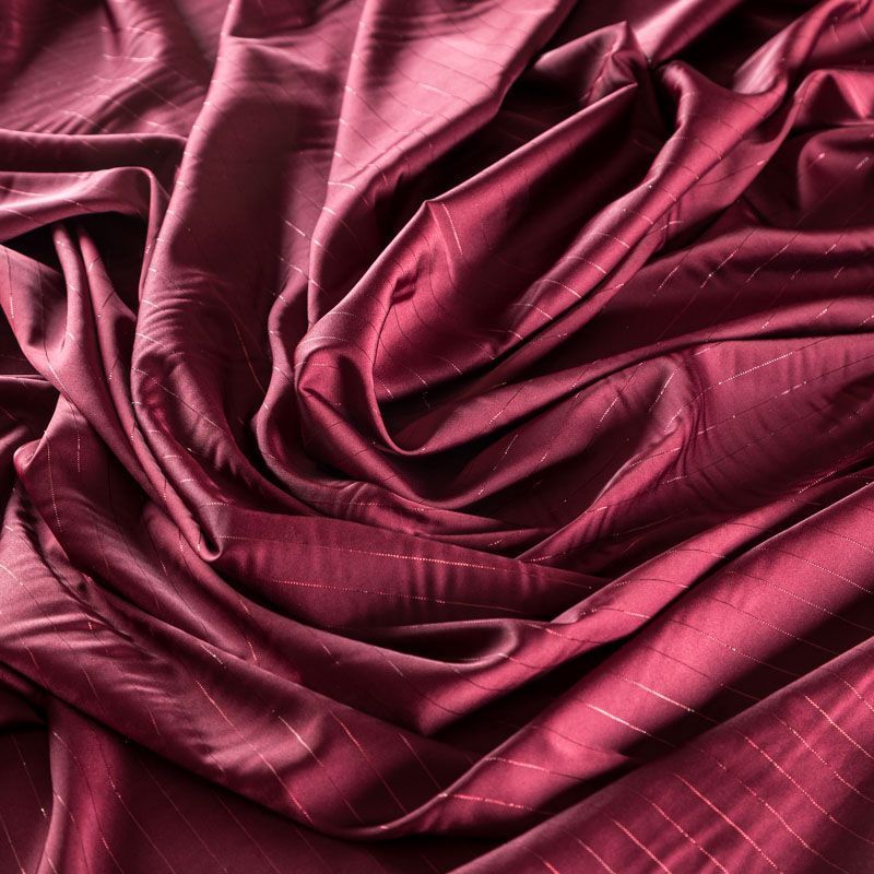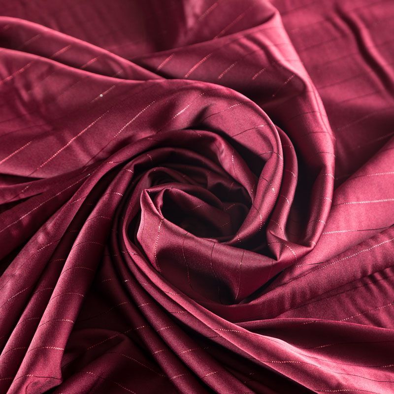 Тонкая, легкая, струящаяся ткань, декорированная тонкими вертикальными полосками люресовой нити, не просвечивает, очень нежная и прятная к телу, обладает благородным атласным блеском, хорошо драпируется, тянется за счет эластана в составе. Идеально подойдет для пошива блузок, платьев и юбок, а также топов, платков, домашней одежды.