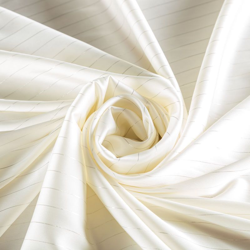 Тонкая, легкая, струящаяся ткань, декорированная тонкими вертикальными полосками люресовой нити, не просвечивает, очень нежная и прятная к телу, обладает благородным атласным блеском, хорошо драпируется, тянется за счет эластана в составе. Идеально подойдет для пошива блузок, платьев и юбок, а также топов, платков, домашней одежды.