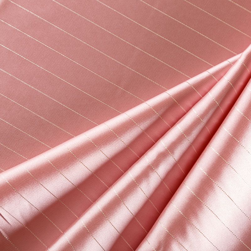 Тонкая, легкая, струящаяся ткань, декорированная тонкими вертикальными полосками люресовой нити, не просвечивает, очень нежная и прятная к телу, обладает благородным атласным блеском, хорошо драпируется, тянется за счет эластана в составе. Идеально подойдет для пошива блузок, платьев и юбок, а также топов, платков, домашней одежды.