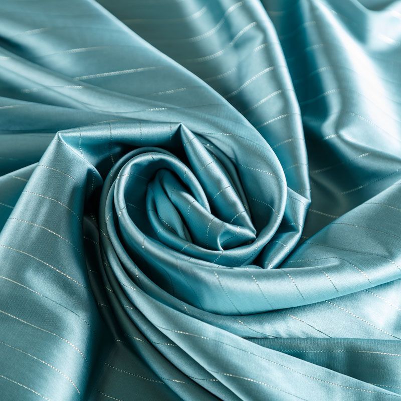 Тонкая, легкая, струящаяся ткань, декорированная тонкими вертикальными полосками люресовой нити, не просвечивает, очень нежная и прятная к телу, обладает благородным атласным блеском, хорошо драпируется, тянется за счет эластана в составе. Идеально подойдет для пошива блузок, платьев и юбок, а также топов, платков, домашней одежды.