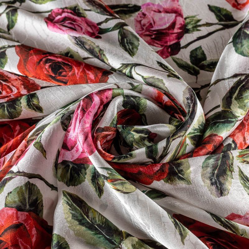 Итальянский жаккардовый шелк с цветочным принтом  Поверхность ткани фактурная "под рептилию", со сдержанным блеском, смотрится оригинально и необычно. Ткань тонкая и легкая, немного просвечивает, может потребоваться подклад, струится, хорошо драпируется. Подойдет для летних вечерних и коктельных платьев, накидок, юбок, блузок, топов, костюмов, широких брюк, домашней и пляжной одежды.
