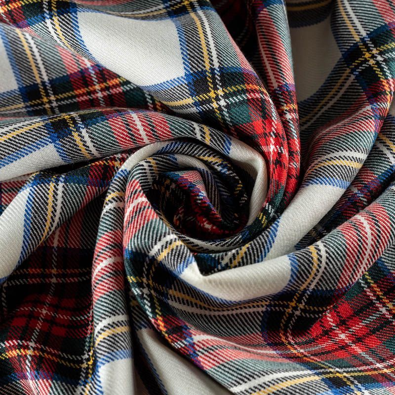 Костюмная шерсть в красно-зеленую клетку с полосками желтого, черного и синего цветов на молочном фоне. Ткань плотная, но очень хорошо драпируется. Очень мягкая, теплая, уютная. Шерсть не колется, в носке очень комфортная. Клетка не очень крупная, выработка в диагональный рубчик. Подойдет для пошива стильного платья прямого или расклешенного силуэта для сезона осень-зима, юбок, костюмов, жакетов, школьной формы.