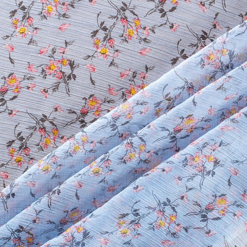 Шифон-жатка голубого оттенка с мелким цветочным принтом. Струящийся, летящий, воздушный, полупрозрачный. На ощупь мягкий и приятный. Подойдет для пошива тончайших воздушных блуз, изумительных платьев со сборками и воланами и элегантных шарфов.