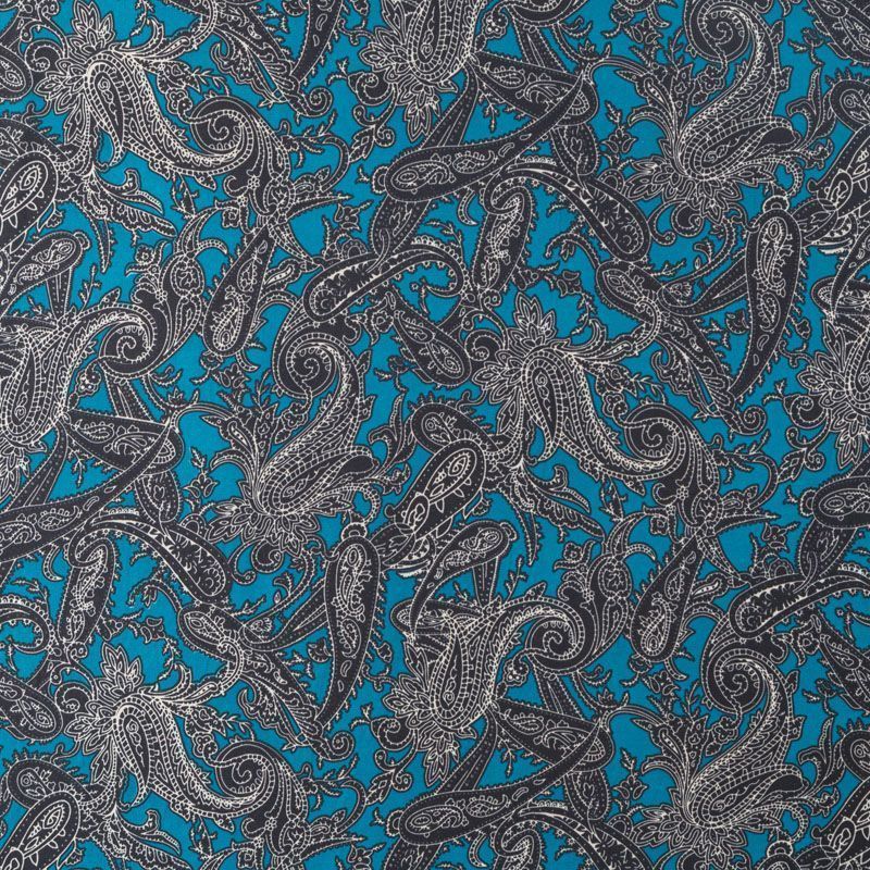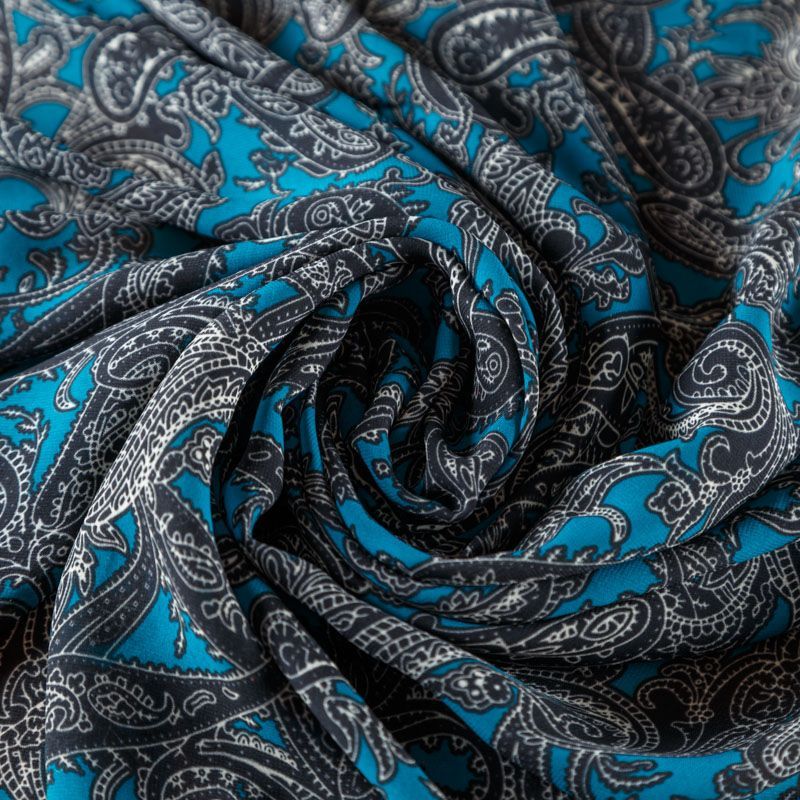 Шифон синего оттенка с черно-белым принтом пейсли. Струящийся, летящий, воздушный, полупрозрачный. На ощупь мягкий и приятный. Подойдет для пошива тончайших воздушных блуз, изумительных платьев со сборками и воланами и элегантных шарфов.