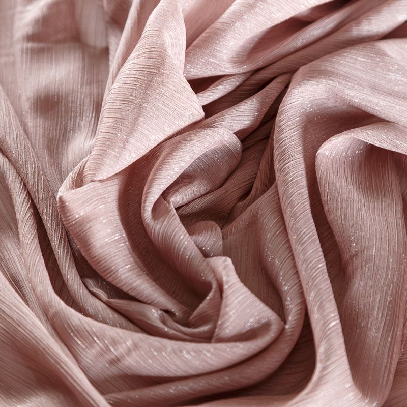Воздушная жатая ткань с прозрачной люрексной нитью, легкая, тонкая, полупрозрачная. Не тянется и хорошо сохраняет форму. На ощупь шифон-жатка очень мягкий и приятный. Подойдет для пошива тончайших воздушных блуз, изумительных вечерних и летних платьев в пол, коротких коктейльных платьев, топов, блузок, туник и элегантных шарфов.