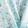 Мягкий и нежный хлопок голубого оттенка с мелким романтичным цветочным принтом украшен изящной вышивкой и перфорацией. Узор выполнен путём машинной вышивки нитками в цвет ткани и расположен вдоль одной кромки, поэтому набирается на изделие объемом. Ткань тонкая, легкая, не сухая, имеет тенденцию к сминаемости, не много просвечивает, не тянется, приятная на ощупь. Идеально подходит для создания летних платьев, сарафанов, юбок, блузок, топов, шорт.