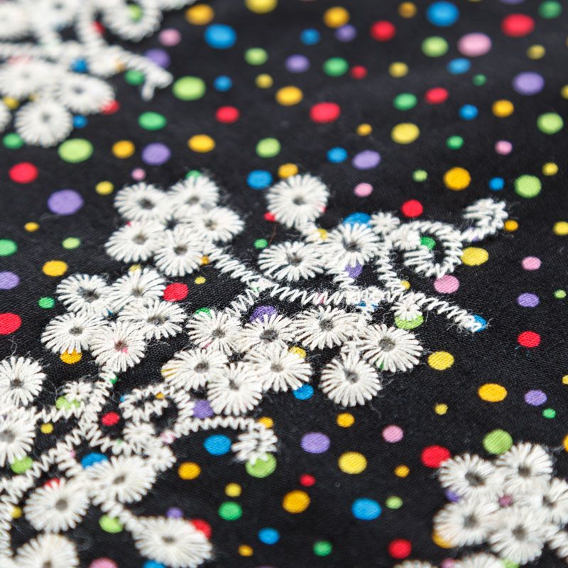 Мягкий и нежный хлопок черного цвета с мелким цветным принтом принтом украшен контрастной вышивкой. Узор выполнен путём машинной вышивки и расположен вдоль одной кромки, образуя фестон, поэтому набирается на изделие объемом. Ткань легкая, не сухая, хорошо драпируется и держит форму, имеет тенденцию к сминаемости, не просвечивает, не тянется, приятная на ощупь. Идеально подходит для создания летних платьев, сарафанов, юбок, блузок, топов, шорт.