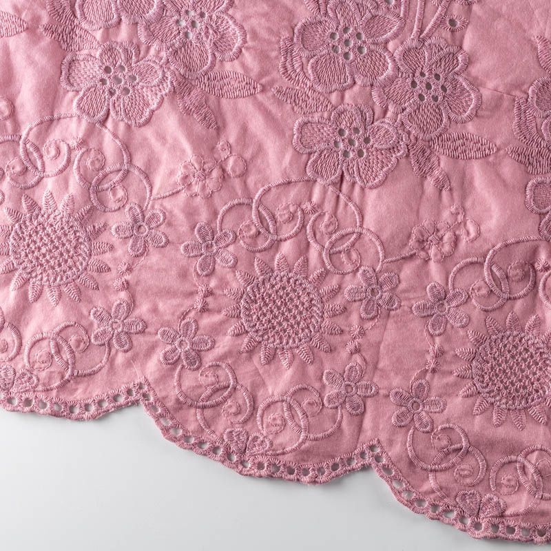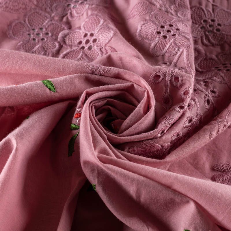 Мягкий хлопок темно-розового оттенка с яркой цветочной вышивкой. Фактура ткани гладкая, имеет тенденцию к сминаемости, немного просвечивает, не тянется, приятная на ощупь. Хлопок прекрасно пропускает воздух, идеально подходит для создания летних платьев, сарафанов, юбок, блузок и топов. Ткань идет купоном (каймой) вдоль одной кромки. Купон выполнен путём машинной вышивки нитками в цвет ткани. Набирается объемом.