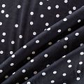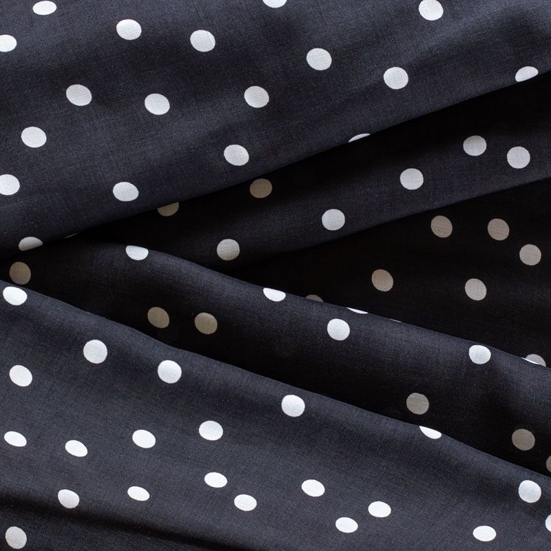 Плательно-блузочный штапель с принтом горох на черном фоне. Мягкий, тонкий, нежный, пластичный, приятный на ощупь, хорошо драпируется, практичный. Подойдет для пошива платья, топа, блузки, рубашки, юбки, летних брюк.