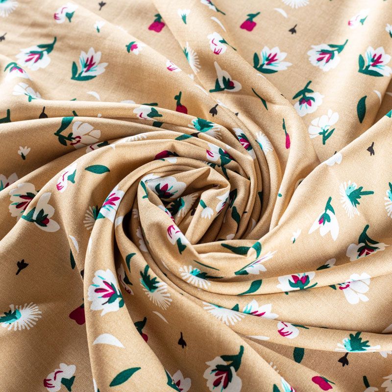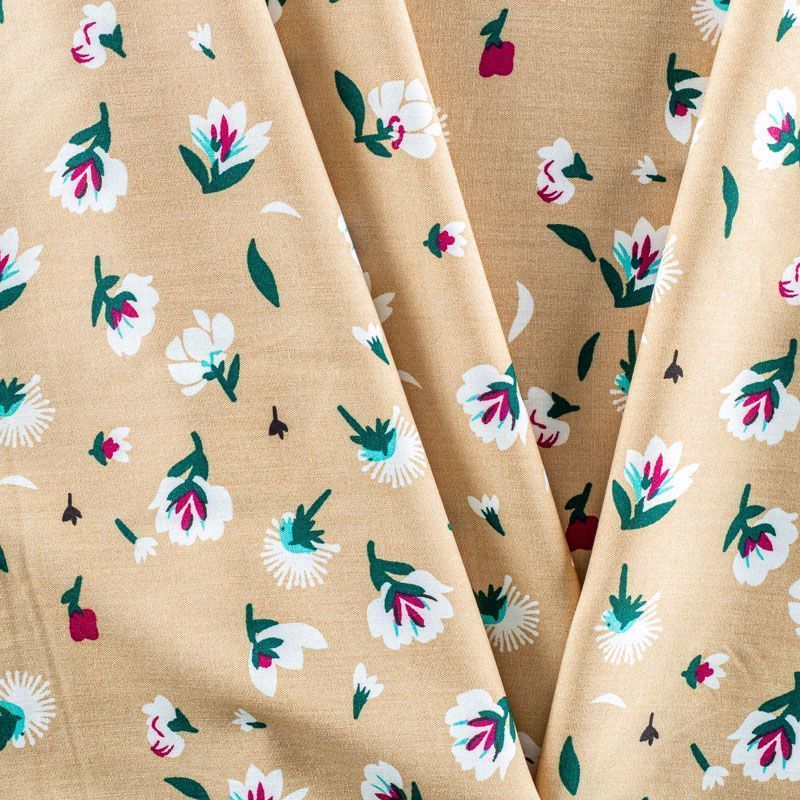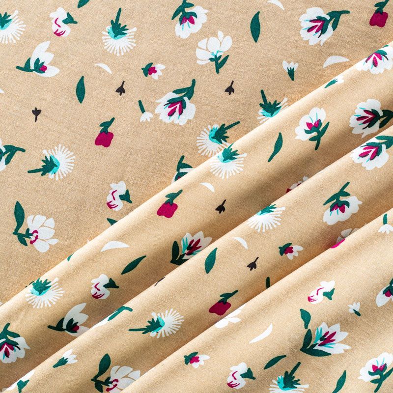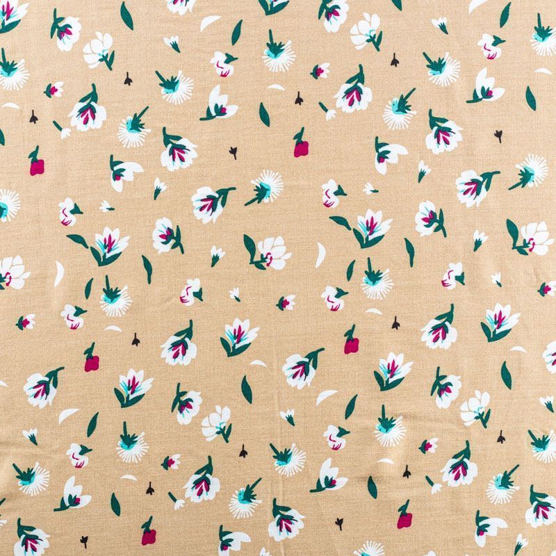 Плательно-блузочный штапель с цветочным принтом на бежевом фоне. Мягкий, тонкий, нежный, пластичный, приятный на ощупь, хорошо драпируется, практичный. Подойдет для пошива платья, топа, блузки, рубашки, юбки, летних брюк.