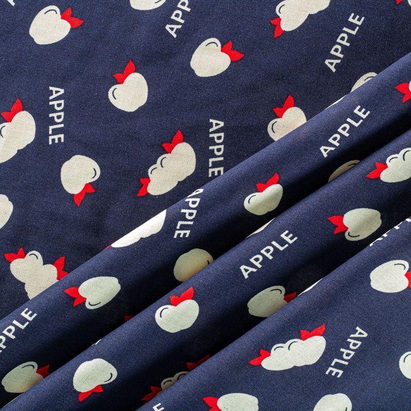 Плательно-блузочный штапель темно-синего оттенка со стилизованными фруктами и надписями. Ткань мягкая, тонкая, нежная, пластичная, приятная на ощупь, хорошо драпируется, практичная, поверхность слегка фактурная. Подойдет для пошива платья, топа, блузки, рубашки, юбки, летних брюк.