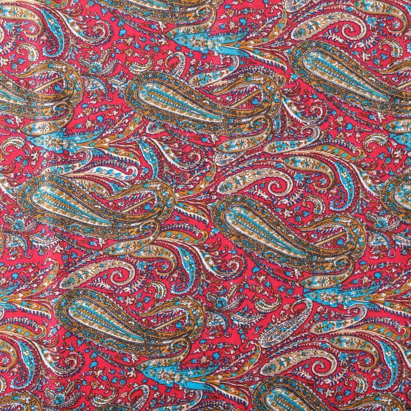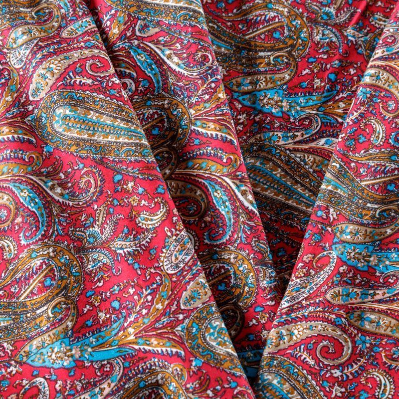 Плательно-блузочный штапель с ярким узором пейсли на малиново-красном фоне. Ткань мягкая, тонкая, нежная, пластичная, приятная на ощупь, хорошо драпируется, практичная. Подойдет для пошива платья, топа, блузки, рубашки, юбки, летних брюк.