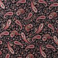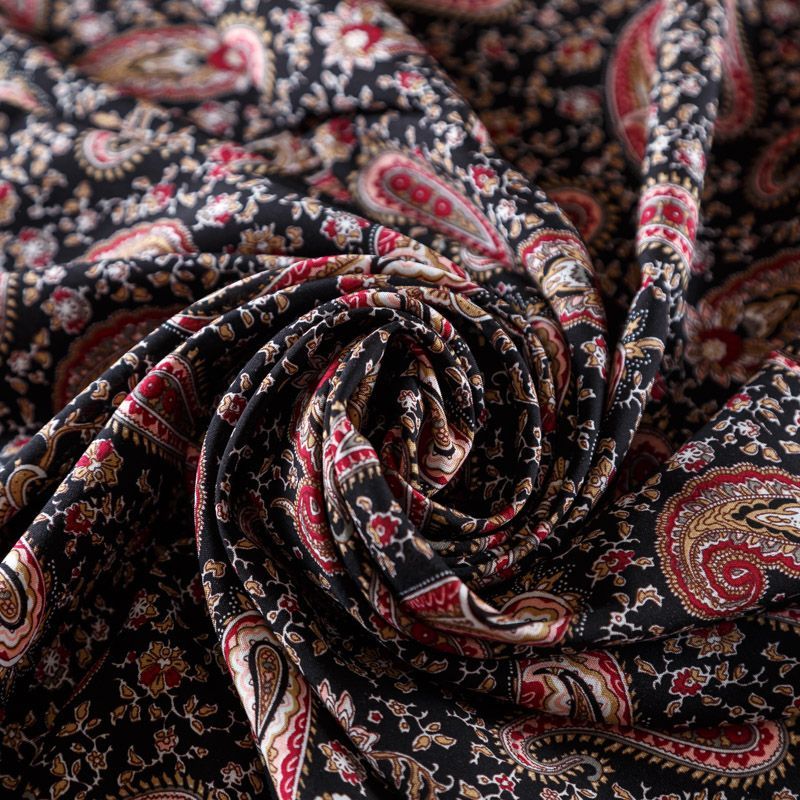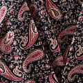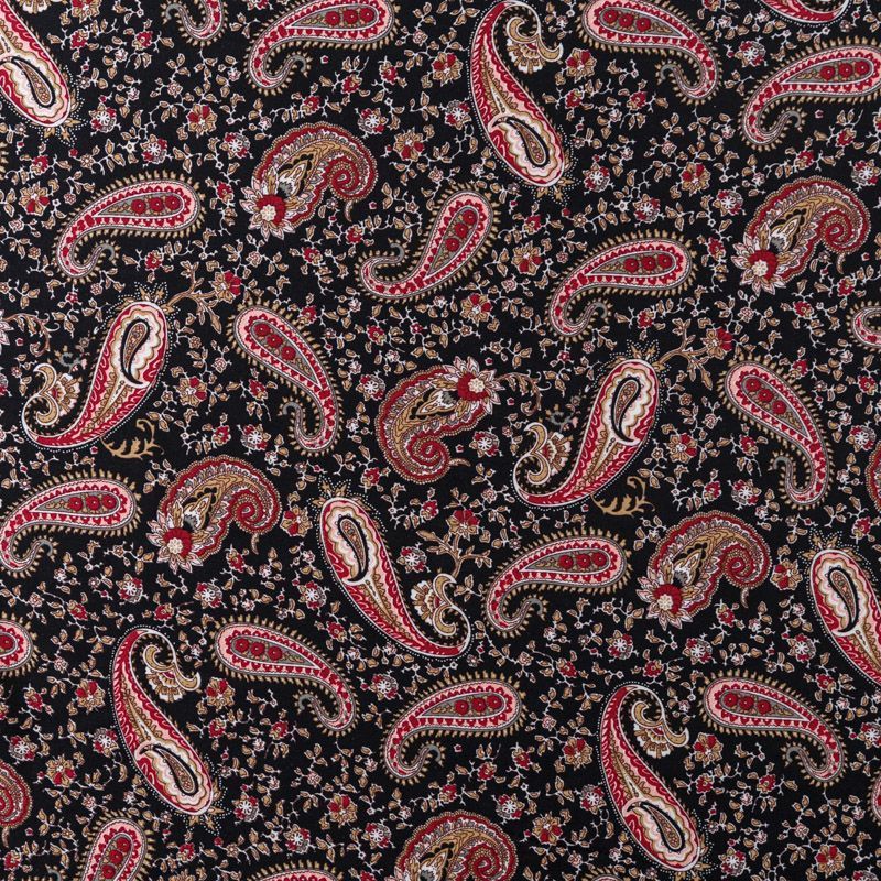 Плательно-блузочный штапель с принтом пейсли на черном фоне. Мягкий, тонкий, нежный, пластичный, приятный на ощупь, хорошо драпируется, практичный. Подойдет для пошива платья, топа, блузки, рубашки, юбки, летних брюк, комбинезона.