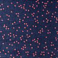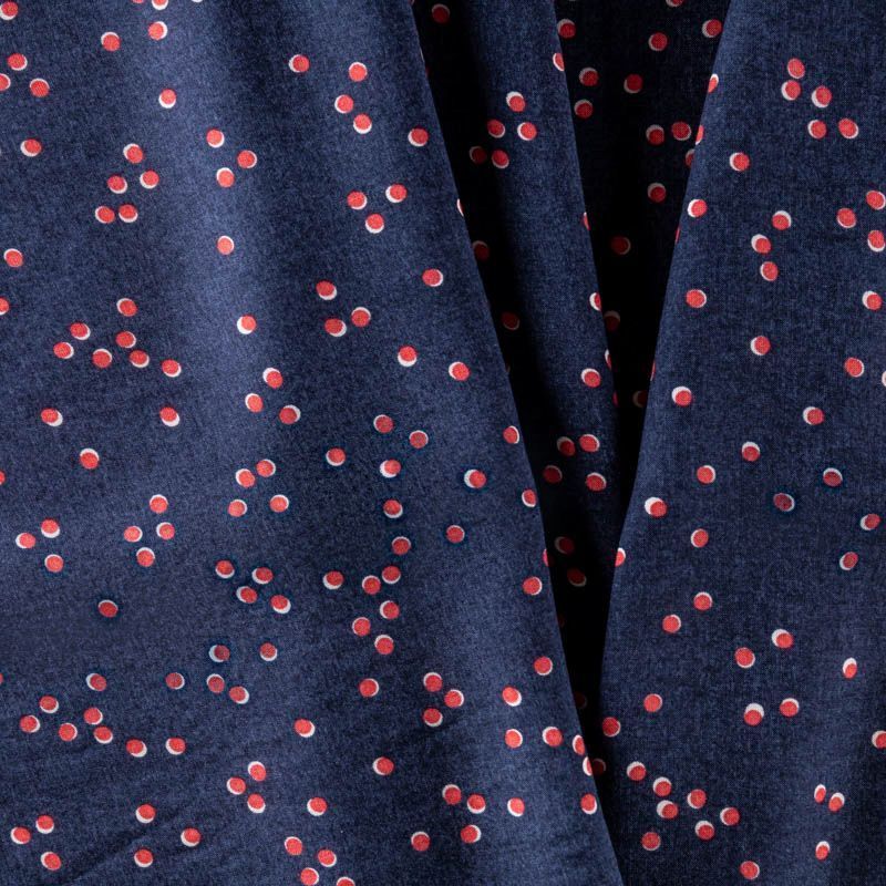 Ткань легкая и пластичная, отлично собирается в мягкие складки, красиво струится. Поверхность гладкая и шелковистая, без блеска. Не просвечивается. Подойдёт для платья, блузки, пляжной туники, топа, летних сарафанов, летящей юбки. Мелкий хаотичный горошек молочно-кораллового цвета освежается спокойный темно-синий фон вискозы.