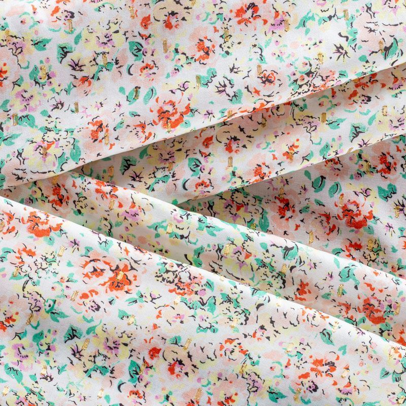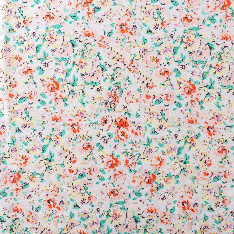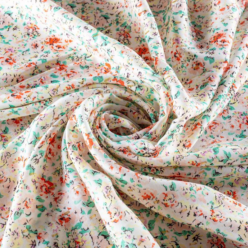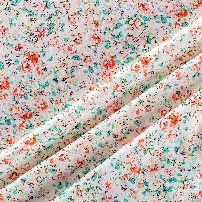 Плательно-блузочный штапель с акварельным растительным принтом на молочном фоне декорирован ресничками из люрексовой нити. Мягкий, тонкий, нежный, пластичный, приятный на ощупь, хорошо драпируется, практичный. Подойдет для пошива платья, топа, блузки, рубашки, юбки, летних брюк.