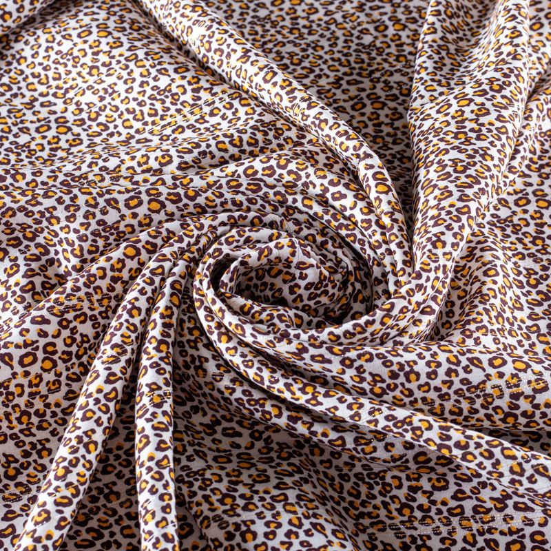 Плательно-блузочный штапель с мелким анималистическим принтом на белом фоне декорирован золотистой люрексовой нитью. Мягкий, тонкий, нежный, пластичный, приятный на ощупь, не много просвечивает, хорошо драпируется, практичный. Подойдет для пошива платья, топа, блузки, рубашки, юбки, летних брюк.