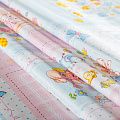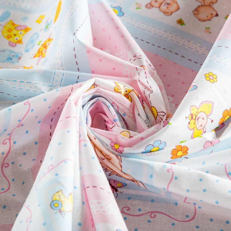 кань полотняного переплетения, тонкая, легкая и мягкая. Не вызывает аллергии, дышит и хорошо впитывает влагу. Милый детский принт в розово-голубых оттенках белом фоне прекрасно подойдет для пошива детской одежды, нательного белья, халатов и пижам.