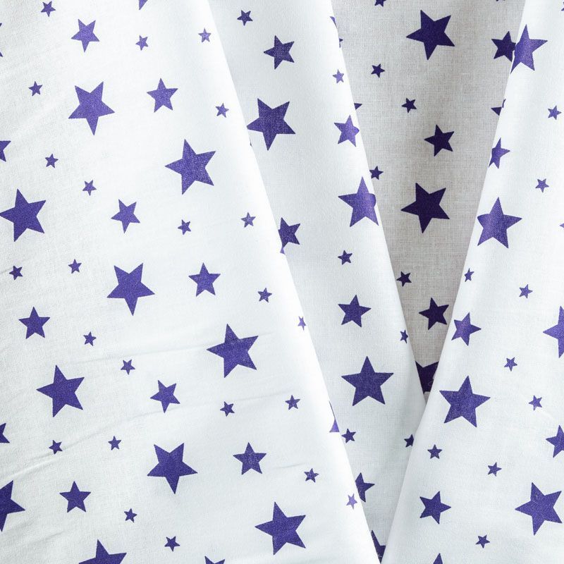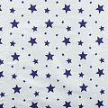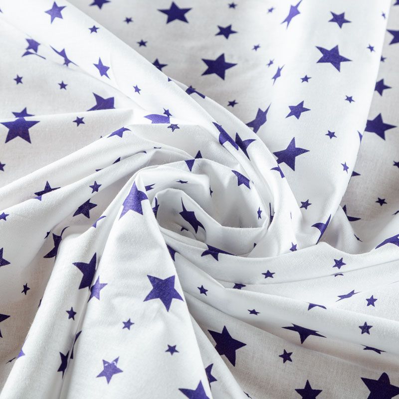Ткань полотняного переплетения, тонкая, легкая и мягкая. Не вызывает аллергии, дышит и хорошо впитывает влагу. Милый  принт в виде синих звездочек на белом фоне прекрасно подойдет для пошива детской одежды, нательного белья, халатов и пижам.
