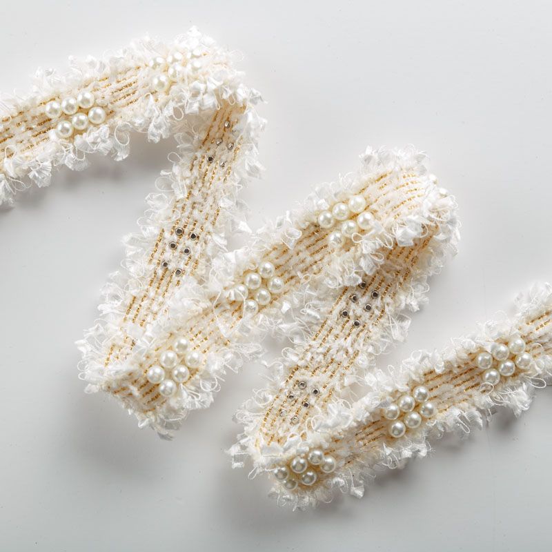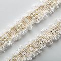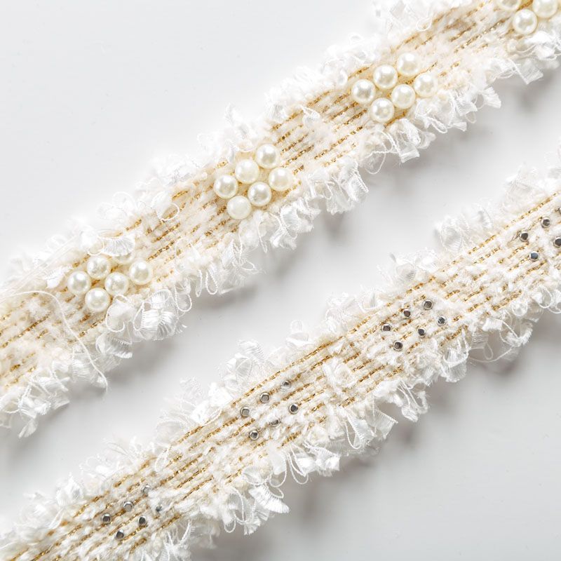 Тесьма декоративная выполнена из бархатистых нитей, прошита люрексом и украшена жемчужными бусинами. Бусины надежно закреплены на тесьме. Подойдет для отделки одежды из твида, букле в стиле Шанель.