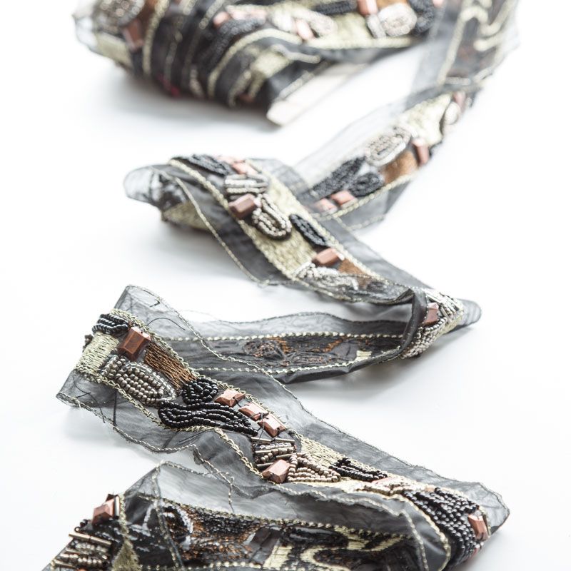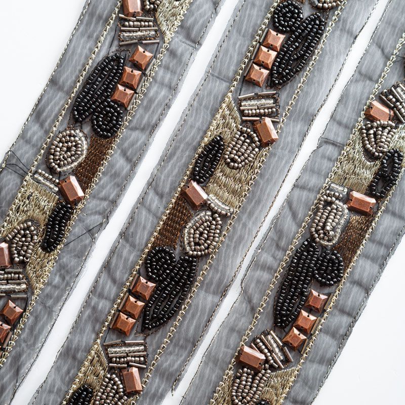 Тесьма представляет собой ленту из черной органзы , лицевая сторона которой декорирована вышивкой, бисером и бусинами. Используется для отделки трикотажа, платьев, рубашек, манжет, вечерней и свадебной одежды, верхней одежды, обуви, сумок, украшений, а также для сценических костюмов.