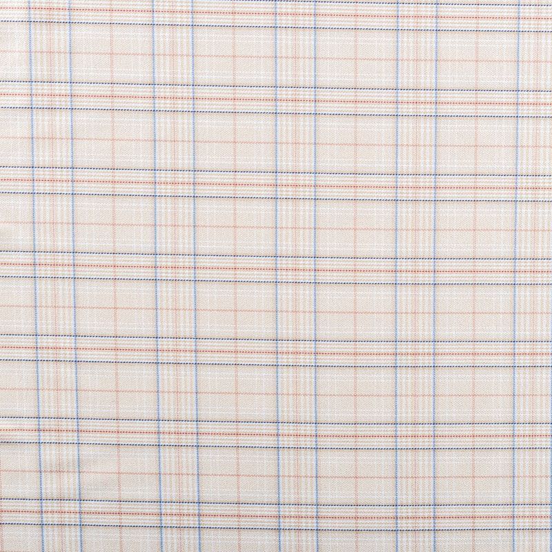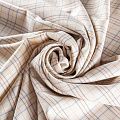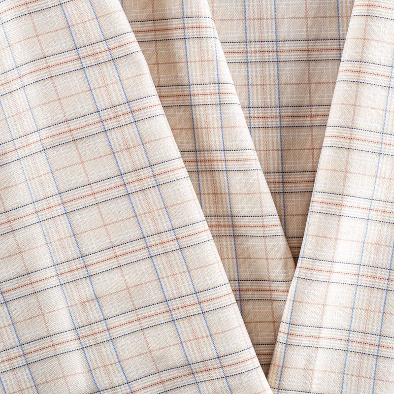 Ткань костюмно-плательной плотности, мягкая и приятная на ощупь, немного тянется за счет эластана в составе, держит форму, хорошо драпируется и образует мягкие складки. Сочетание тонких линий голубого, бежевого и молочного цветов на приятном светлом фоне образует сложную элегантную клетку. Ткань отлично подойдет на костюмы, юбки, брюки, шорты, платья, жакеты.