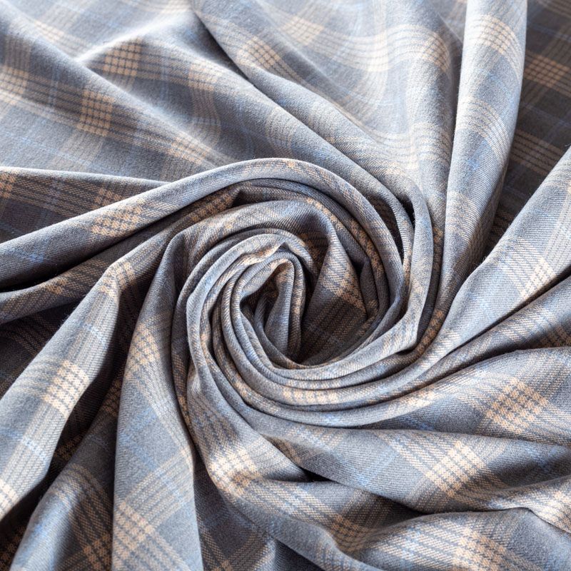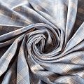 Ткань костюмно-плательной плотности, мягкая и приятная на ощупь, немного тянется за счет эластана в составе, держит форму, хорошо драпируется и образует мягкие складки. Сочетание линий пастельно-желтого и голубого цветов на приятном сером фоне образует сложную красивую клетку. Ткань отлично подойдет на костюмы, юбки, брюки, шорты, платья, жакеты.