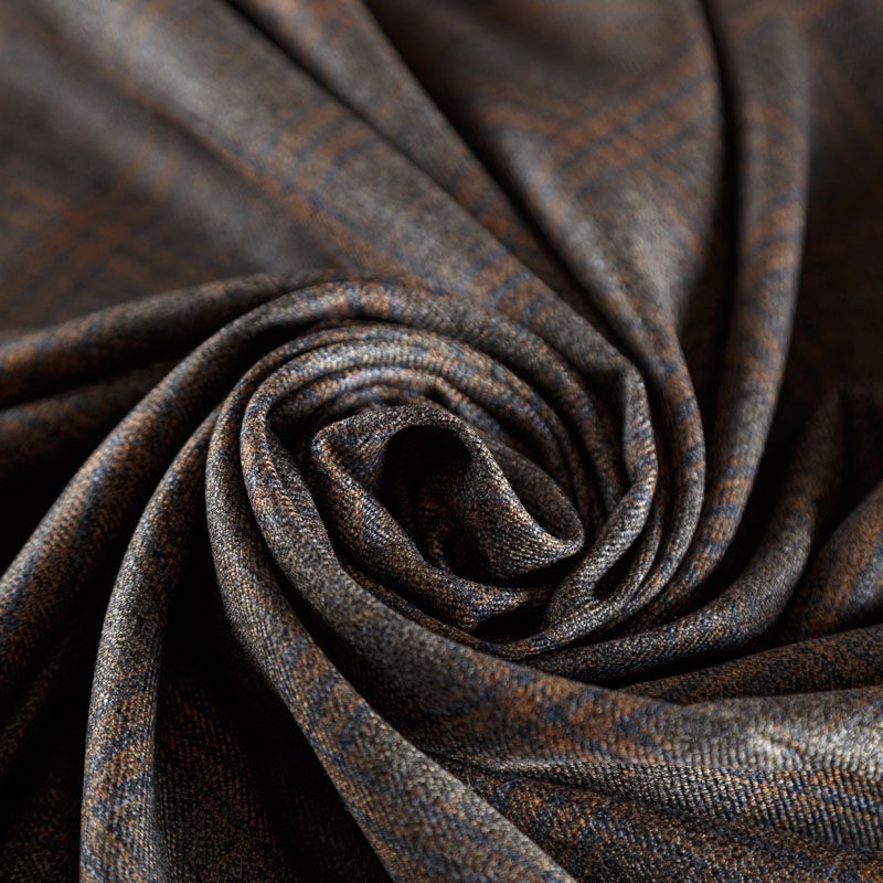 Итальянская костюмная шерсть с кашемиром серо-коричневого оттенка с сочетанием линий синего и приглушенно-оранжевого цвета, которые образуют крисивую и стильную клетку. Ткань очень приятная и мягкая на ощупь, не колется, пластичная, хорошо драпируется, ниспадает. Идеально подойдет для пошива брюк, юбки, платья или сарафана, костюма, жакета, палантина.