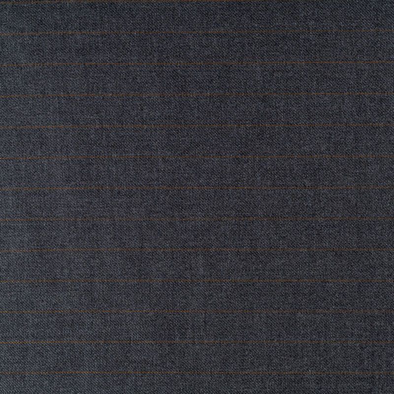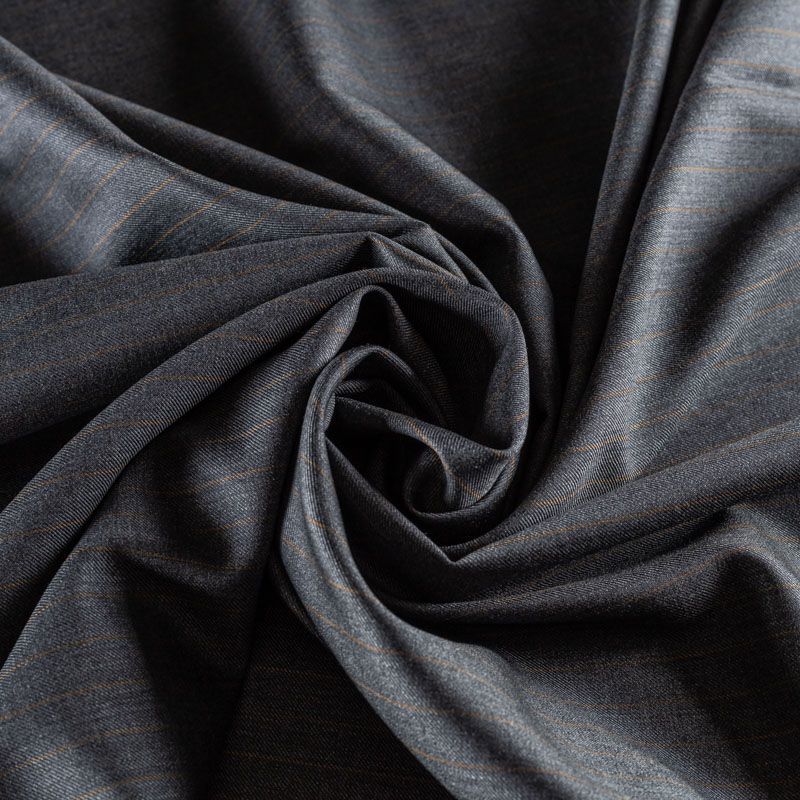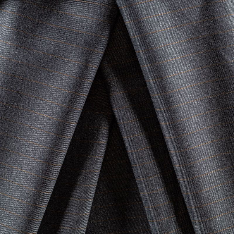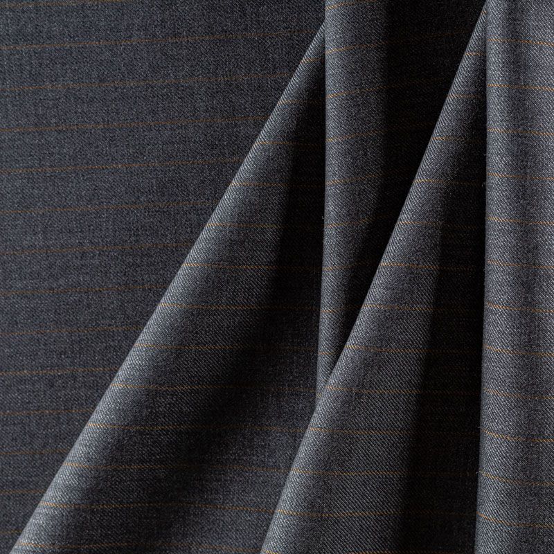 Костюмно-плательная ткань средней плотности, немного суховата, приятная и тонкая на ощупь. На нейтральном сером фоне очень тонкая оранжевая полоска, направление - вдоль кромки. Прекрасно подойдет для пошива брюк-палацио, жакета, платья по фигуре, сарафана, классического мужского или женского костюма.