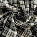 Ткань средней плотности, мягкая и приятная на ощупь, немного тянется, формоустойчива, хорошо драпируется и образует мягкие складки. Сочетание линий серого и черного цветов на белом фоне образует красивую клетку тартан. Ткань отлично подойдет на костюмы, юбки, брюки, платья, жакеты.