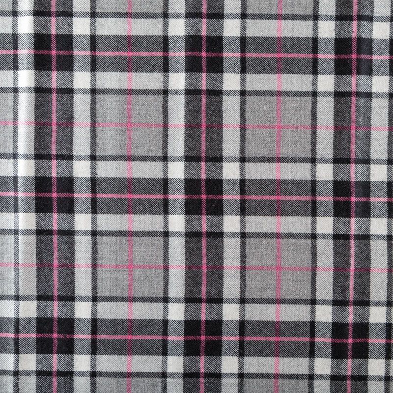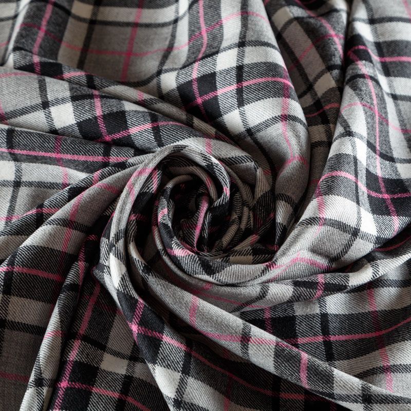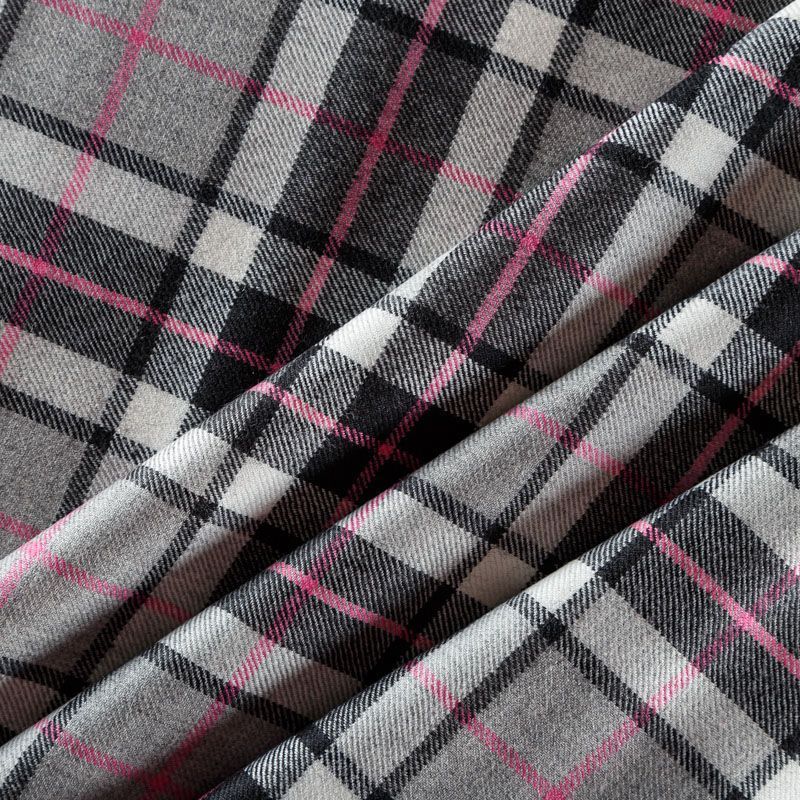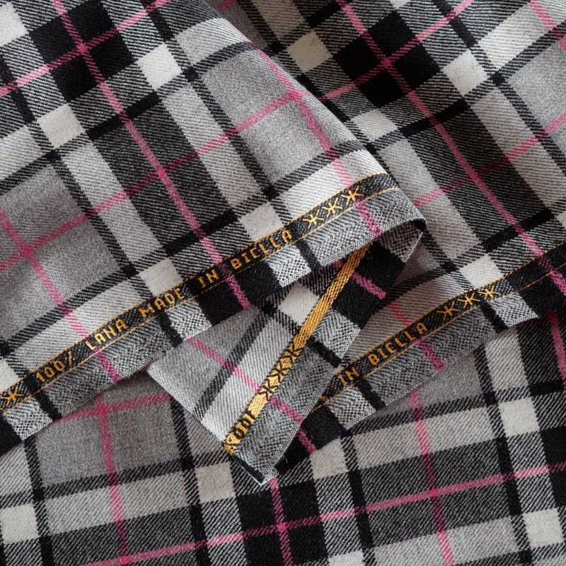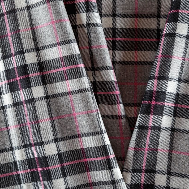 Итальянска шерстяная ткань костюмно-плательной плотности. Сочетание линий черного, серого и розового цветов на фактурном молочном фоне образует сложную красивую клетку тартан. Ткань прочная, мягкая и приятная на ощупь, немного тянется, формоустойчива, хорошо драпируется и образует мягкие складки. Отлично подойдет для пошива костюма, юбки, брюк, платья, жакета.