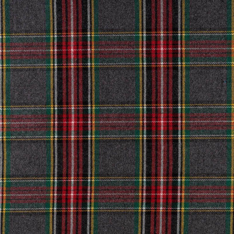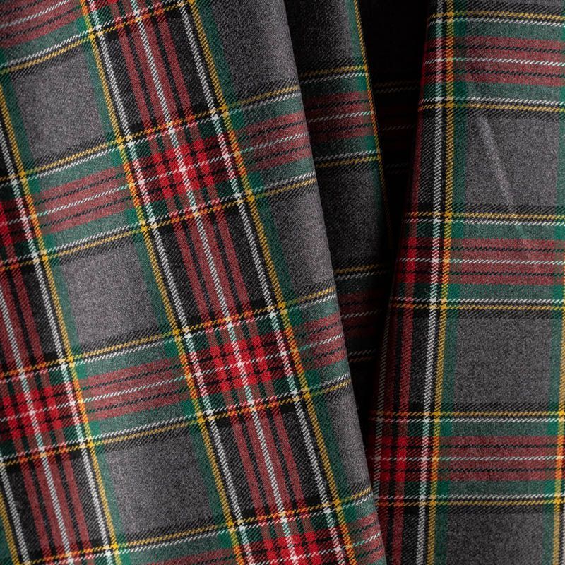 Ткань средней плотности, мягкая и приятная на ощупь, немного тянется, формоустойчива, хорошо драпируется и образует мягкие складки. Сочетание линий желтого, зеленого, черного и белого цветов на сером фоне образует сложную красивую клетку тартан. Ткань отлично подойдет на костюмы, юбки, брюки, платья, жакеты.