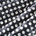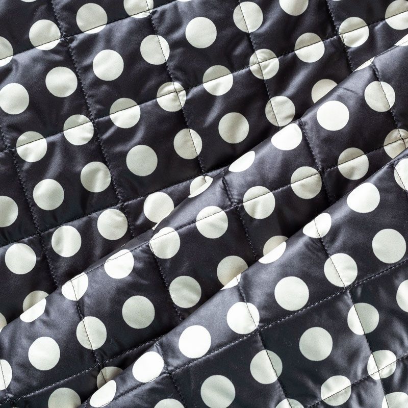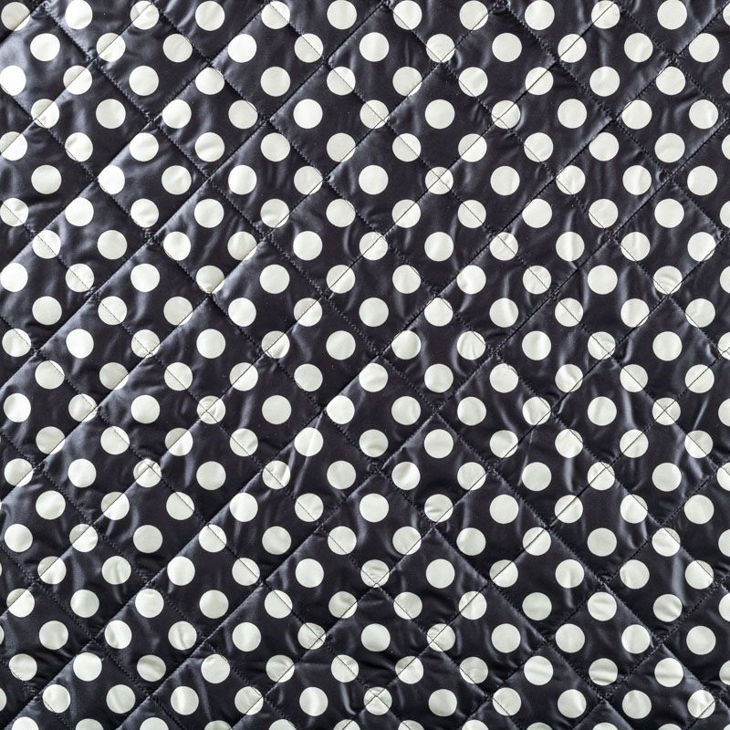 Трехслойная итальянская курточная ткань черного цвета в молочный горох, простеганная не крупными ромбами размером 3х3 см. Нижний слой черного цвета, заменяет подклад, средний слой - синтепон, верхний слой - матовый полиэстер, напоминающий болонь. Ткань легкая, пластичная, хорошо драпируется. Прекрасно подойдет для  пошива легких пальто, курток, бомберов, жилетов, накидок-кейпов, объемных сумок, одежды для домашних питомцев, туристического снаряжения.