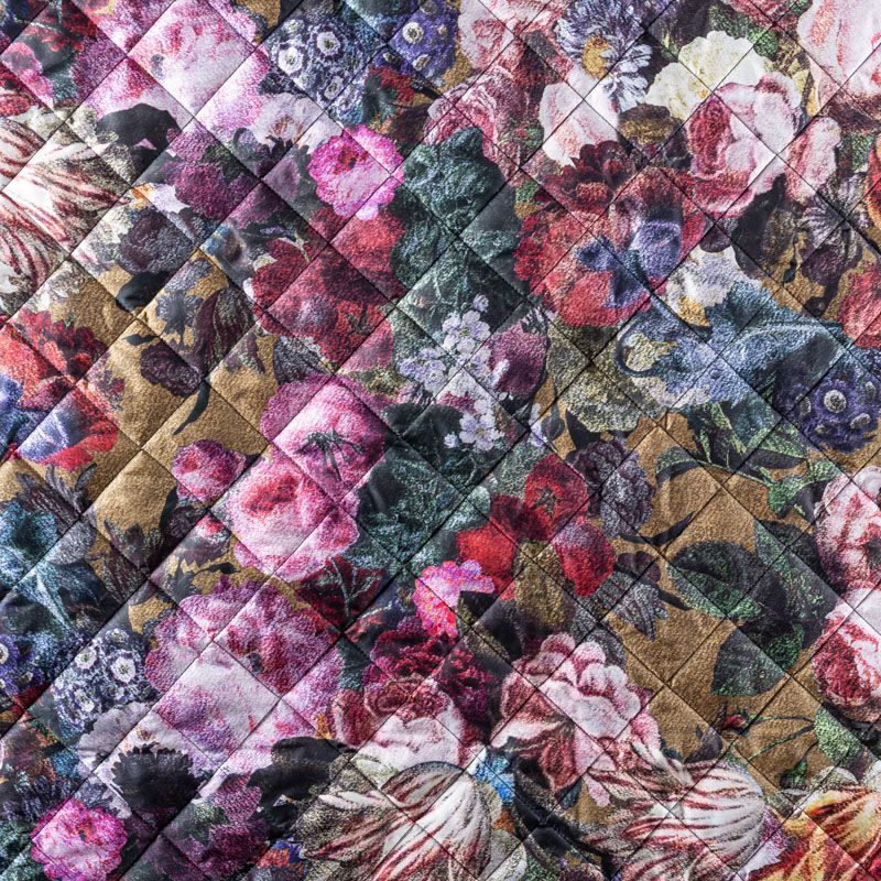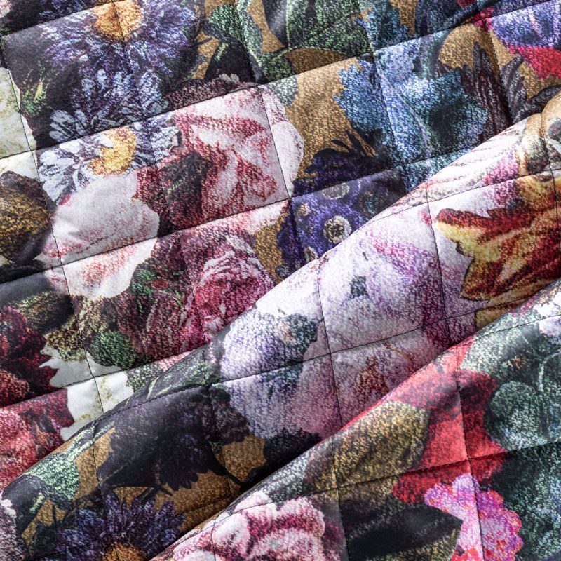 Трехслойная итальянская курточная ткань оттенка хаки с цветочным принтом, простеганная не крупными ромбами размером 3х3 см. Нижний слой черного цвета, заменяет подклад, средний слой - синтепон, верхний слой - красочный матовый полиэстер, напоминащий болонь. Ткань легкая, пластичная, хорошо драпируется и держит форму. Прекрасно подойдет для пошива легких пальто, курток, бомберов, жилетов, накидок-кейпов, объемных сумок, одежды для домашних питомцев, туристического снаряжения.