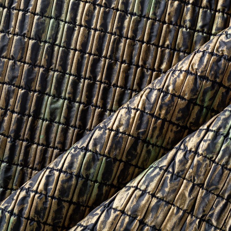 Оригинальная трехслойная итальянская курточная ткань состаренного золотистого оттенка с эффектом жатки, простеганная не крупными прямоугольниками. Нижний, черного цвета, заменяет подклад и верхний слой - полиэстер, по качеству напоминает болонь, а по фактуре кожу рептилии, между ними синтепон. Ткань легкая, пластичная, хорошо держит форму, отлично тянется по долевой, набирается на изделие объемом. Прекрасно подойдет для пошива легких пальто, курток, бомберов, жилетов, накидок-кейпов, объемных сумок, одежды для домашних питомцев, туристического снаряжения.