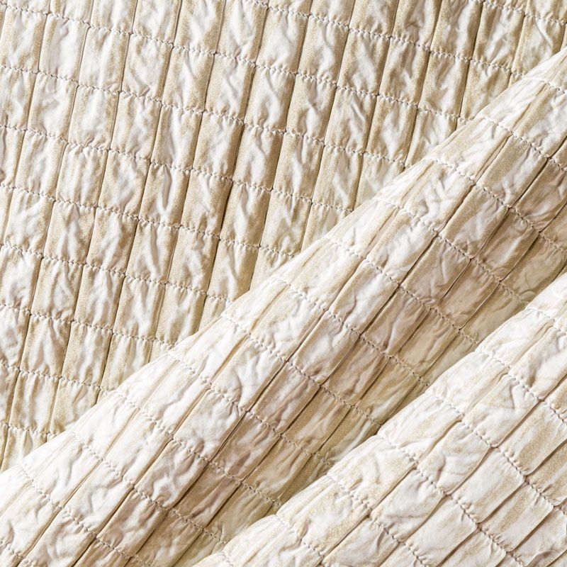 Оригинальная трехслойная итальянская курточная ткань бежевого оттенка с эффектом жатки, простеганная не крупными прямоугольниками. Нижний, черного цвета, заменяет подклад и верхний слой - полиэстер, по качеству напоминает болонь, а по фактуре кожу рептилии, между ними синтепон. Ткань легкая, пластичная, хорошо держит форму, отлично тянется по долевой, набирается на изделие объемом. Прекрасно подойдет для пошива легких пальто, курток, бомберов, жилетов, накидок-кейпов, объемных сумок, одежды для домашних питомцев, туристического снаряжения.